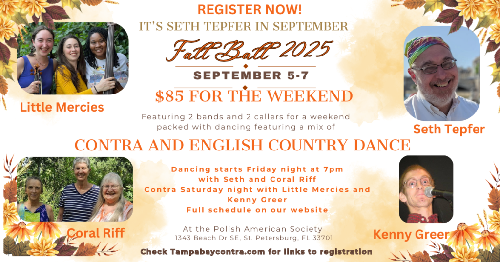 Fall is in the air (well, in some places, anyway), and that means it’s time for one of our beloved Florida dance weekends. The Tampa Friends of Old Time Dance are hosting their Fall Ball from September 5-7. Tickets are $85 for the full weekend.
