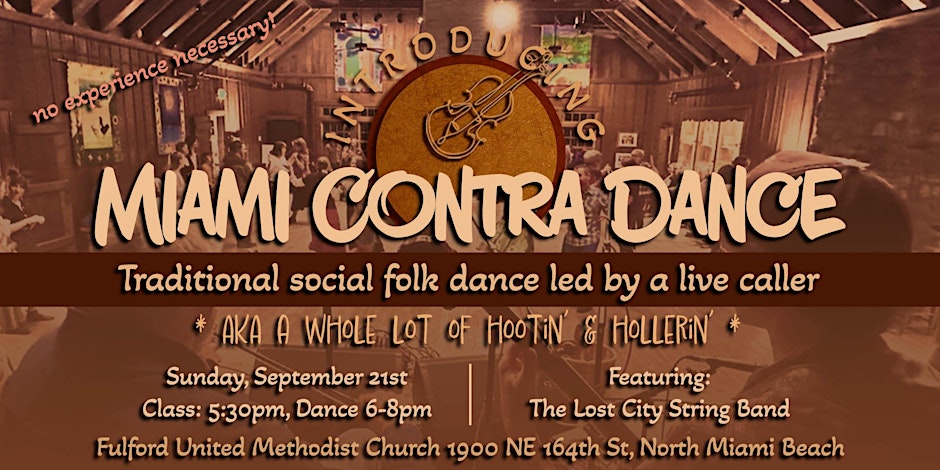 We are THRILLED to announce the return of contra dance to North Miami Beach! The inaugural dance at Fulford United Methodist Church will feature tunes from the Lost City String Band and calls from Mandy Albert. If you’re in Miami and the drive up to Boca sounded a little too long, now’s your chance!